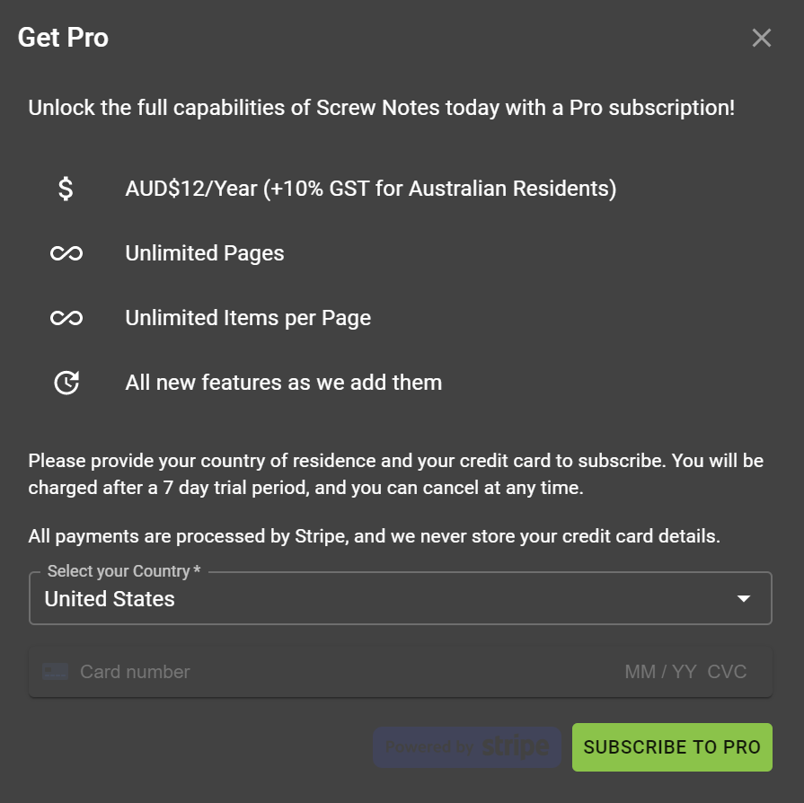So, as of right now, Screw Notes Pro is just AUD$12/year (that's $1/month!). Going Pro gives you unlimited pages and items on each page, and any new Pro features we add in the future!