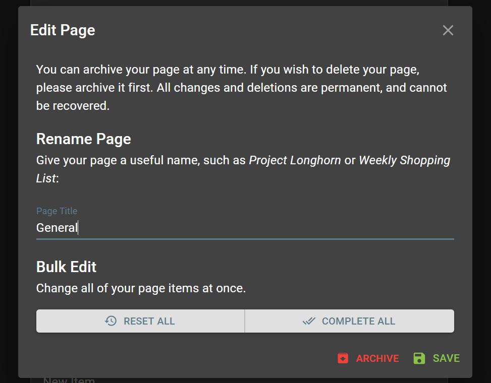 If you're using a page for something recurring, like a Shopping List, you can now bulk complete or bulk restore all the items within a page. Simply click on the Edit button for the page, and use the Reset All or Complete All buttons.