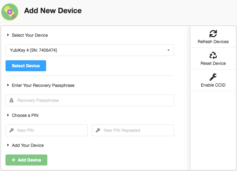 And finally, if anything goes wrong you can click the Reset Device button on the right, and your YubiKey will be reverted to factory settings so you can try adding it again. If you're using your YubiKey for FIDO U2F authentication, or the OTP part of it, don't worry: we don't actually touch those parts of your YubiKey, we just modify the smart card (CCID) part of it.