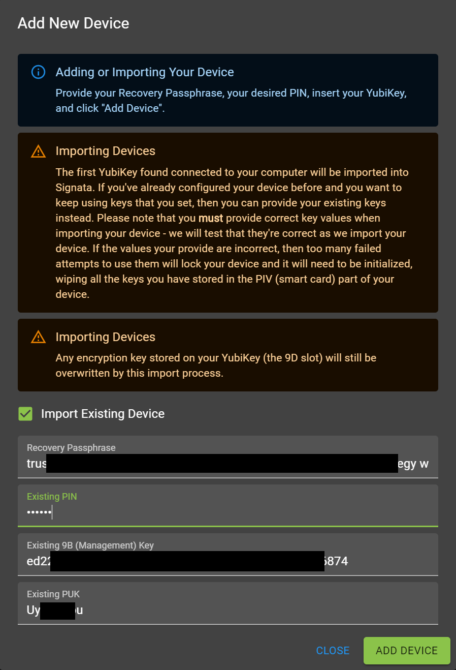 If you know your existing Management Key (a.k.a. the 9B key) and PUK for your YubiKey, then you can provide those and we'll add your device into Signata using them instead of generating new ones. If you do use this, please just be careful with the keys you provide - if you've got them wrong, and you fail to import your device multiple times, then you run the risk of admin-blocking your YubiKey. This isn't fatal to your YubiKey, but to manage the smart card part of your YubiKey again you will need to factory reset the PIV applet on it, wiping all keys you've stored on there. The U2F and OTP parts of your YubiKey will remain untouched.