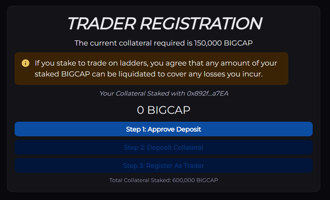 To register as a trader, simply browse to https://bigcap.io/#/ladder and follow the steps in the Trader Registration section. This is the only step that requires an on-chain transaction to deposit BIGCAP tokens as collateral for the ladder: